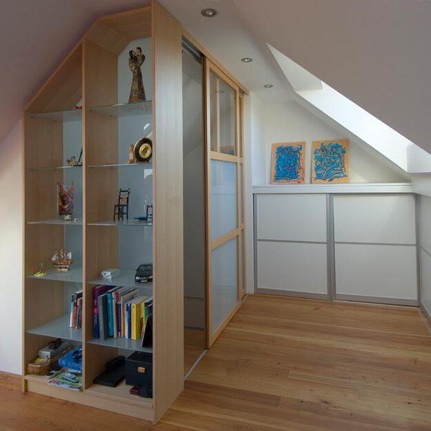 Einbauschrank mit einer geöffneten weißen Gleittür
