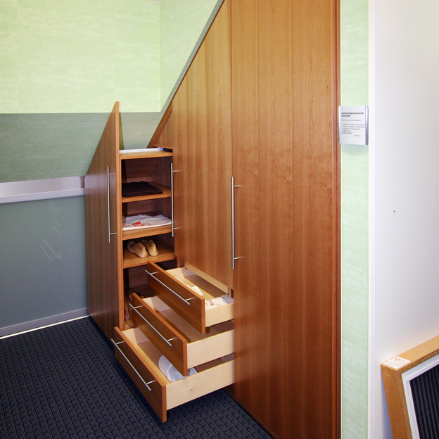 Bei uns können Sie in unserer Ausstellung zahlreiche Beispiele maßgefertigter Möbel sowie Türen, Fenster, Büromöbel live erleben. Dachschrägenschrank? Erleben Sie selbst, wieviel Stauraum sich dahinter verbirgt! Begehbarer Kleiderschrank? Treten Sie ein! Innovativer Arbeitsbereich? Probieren Sie es aus! Einbruchhemmende Fenster? Machen Sie den Versuch!